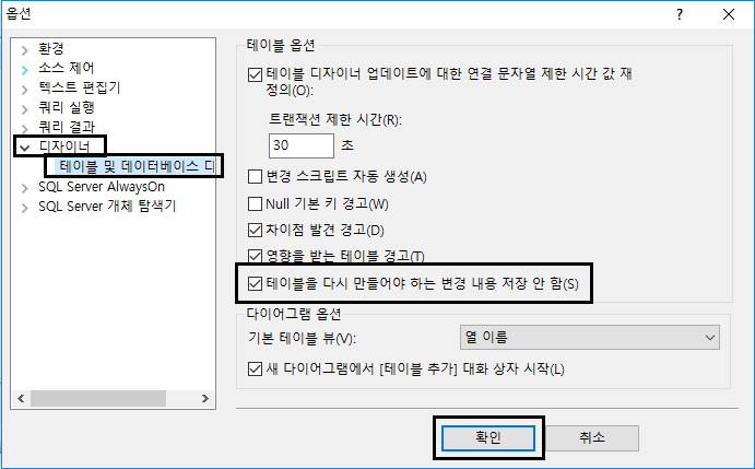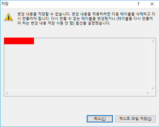 위처럼 테이블 및 데이터베이스...의 테이블 옵션에 들어와서 테이블을 다시 만들어야 하는 변경 내용 저장 안 함을 체크 해제 한 후 확인 버튼 클릭하고 다시 저장을 해보면 잘 된다.